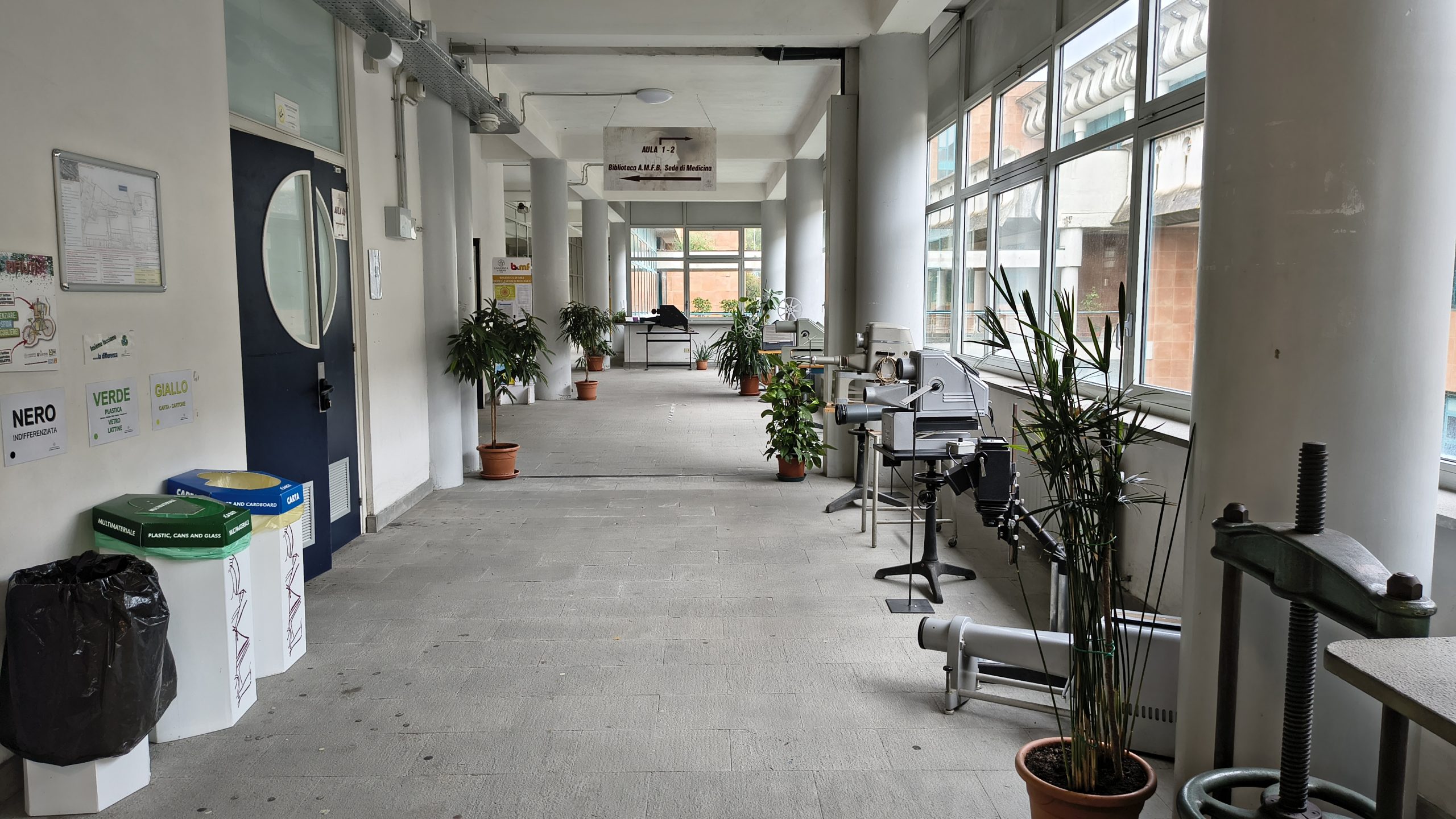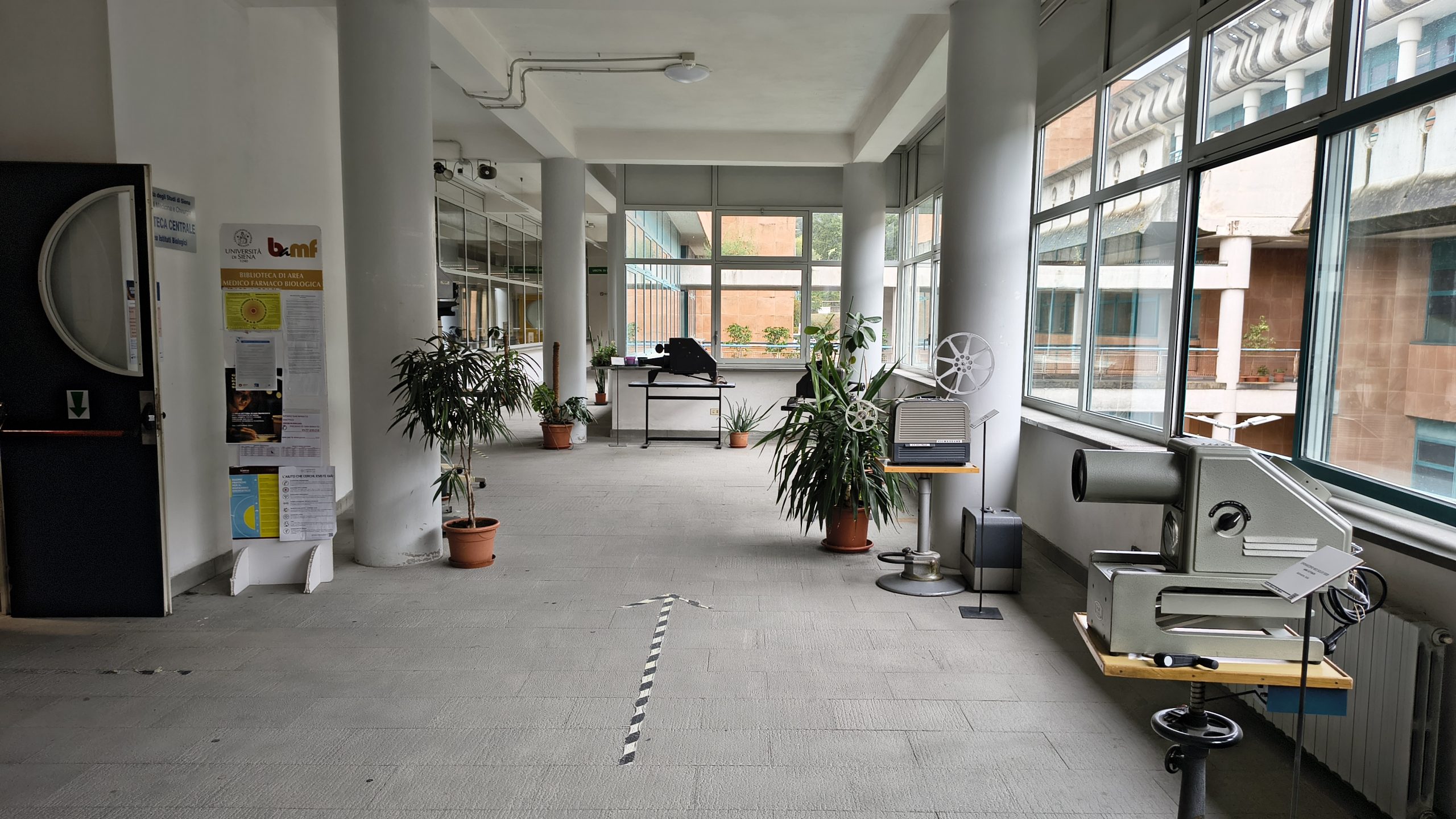 Lungo il corridoio di ingresso alla Biblioteca di Medicina (blocco didattico piano 1) sono esposti proiettori epidiascopici utilizzati dall’Ateneo senese per la didattica o la presentazione di contributi in varie occasioni come congressi o incontri scientifici.