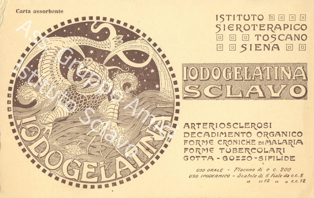 L’Istituto Sclavo non si sottrae a tale pratica della pubblicità per alcuni dei suoi prodotti, se è vero che nel 1911 sul giornale «Il Ponte di Pisa» pubblica il seguente messaggio: «La Jodo Gelatina scoperta dal prof. Sclavo e da lui introdotta nella pratica medica, sostituisce con vantaggio tutti gli altri preparati jodici».